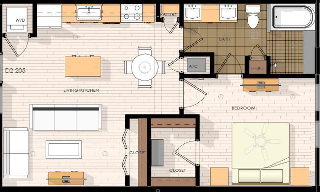 Every unit features a king-size bedroom, spa-inspired bathroom with natural stone walk-in shower, in-floor heating, and a double-sink vanity, plus a standalone kitchen island perfect for cooking and entertaining. Luxury vinyl wood and tile flooring, dimmable lighting, and full-size front-load washer and dryer round out the package.