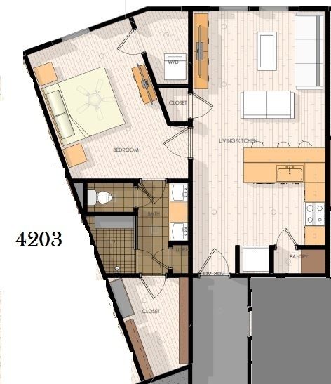 At 806 sq ft, this 1 bed / 1 bath is finished at a level you won't find in most College Station rentals. Natural stone walk-in shower with floor heaters, double sink vanity, king-size bedroom, standalone kitchen island, dimmable lighting, and front-load washer and dryer machines included. Wood vinyl and tile throughout.